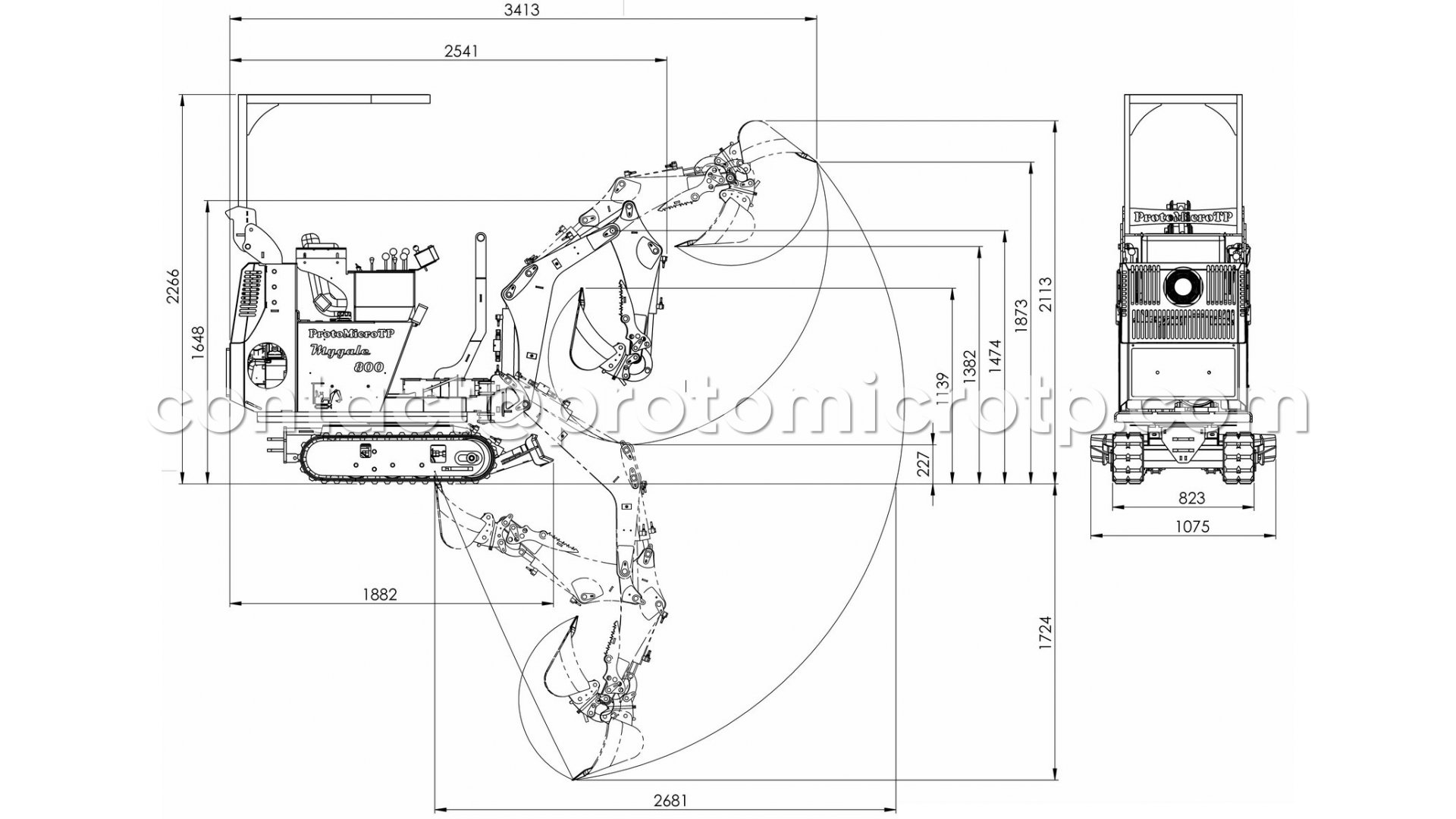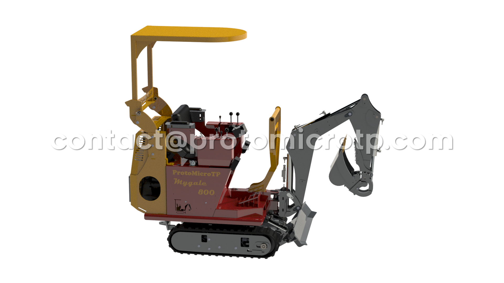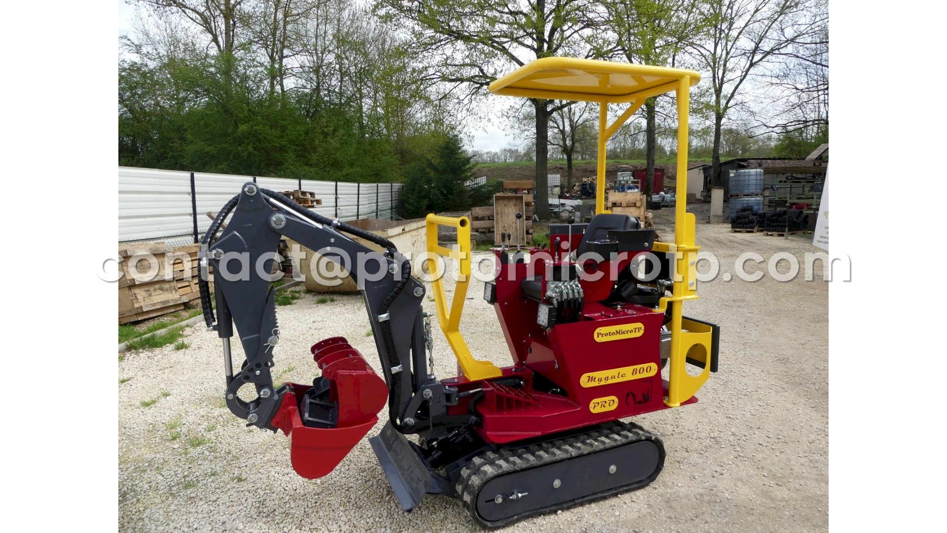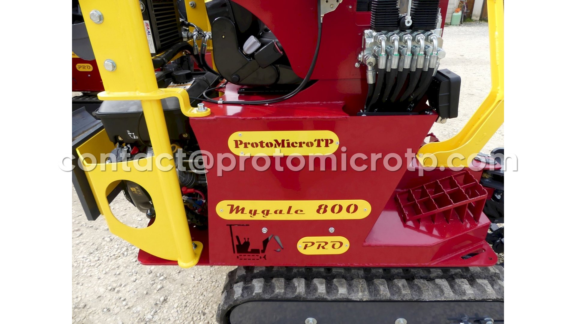 Modèle de milieu de gamme de la série Mygale, avec une largeur de 83cm, la Micro Pelle Mygale 800 Pro est dotée d'une tourelle pivotant à 360° et d'un pied de flèche à 110°,