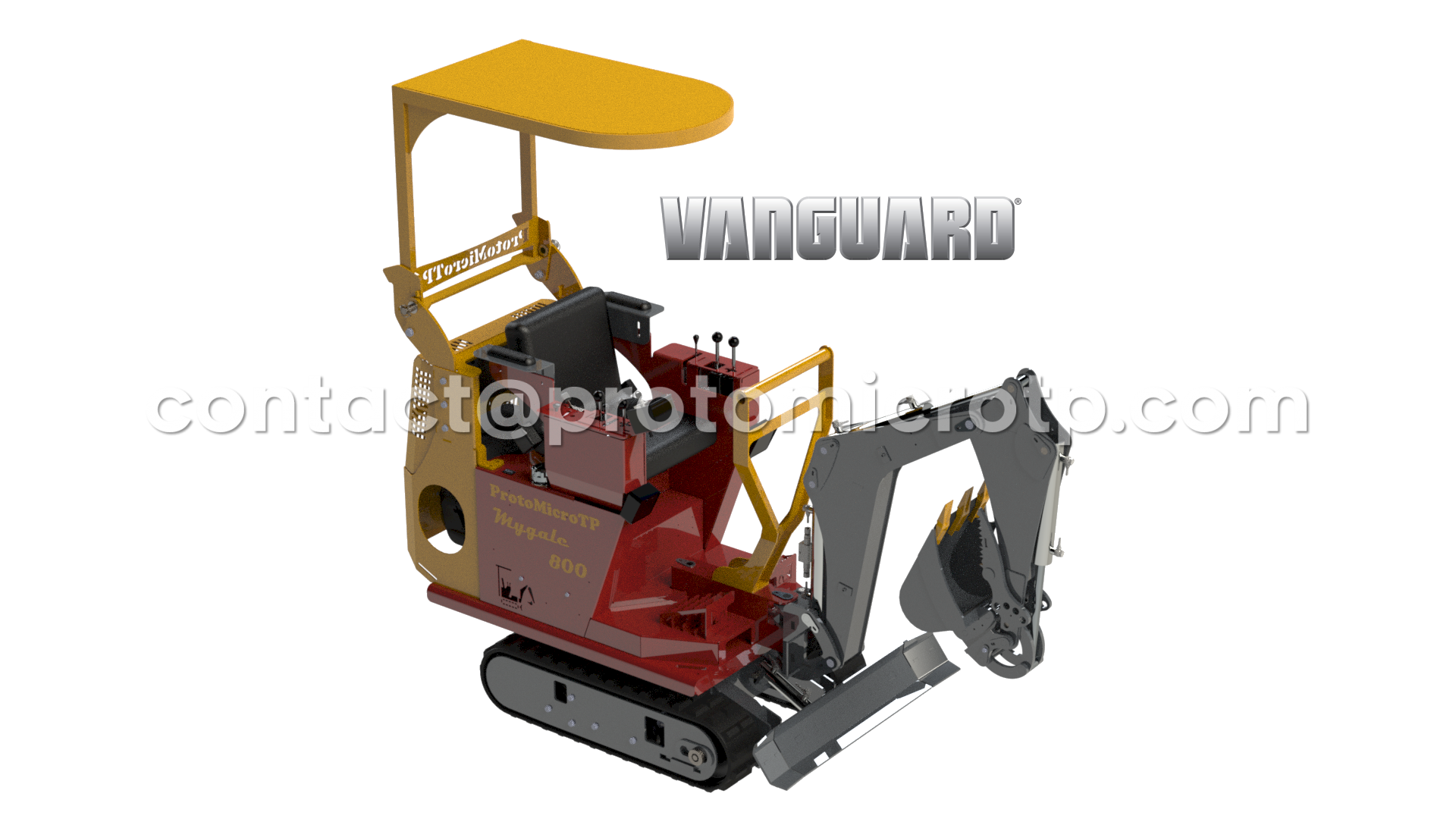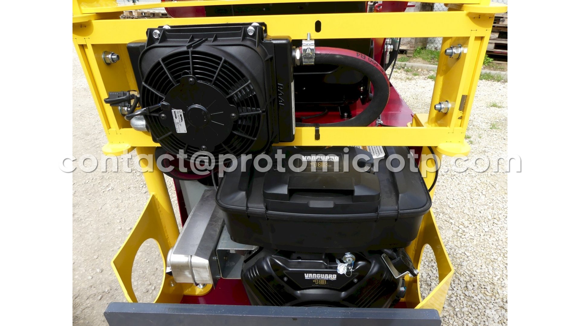 moteur bicylindre Vanguard Briggs & Stratton de 18ch, d'un canopi pliable ou démontable, d'une ligne hydraulique d'accessoires, d'une attache rapide pour les godets, d'un pouce mécanique et