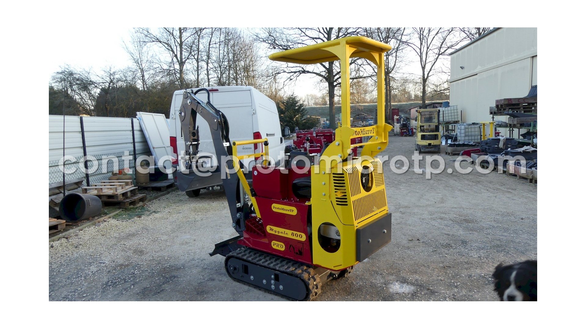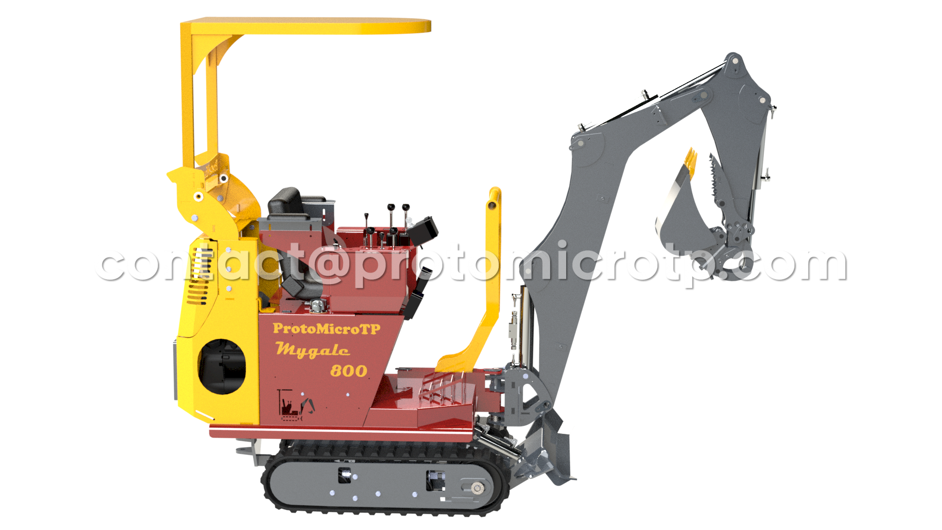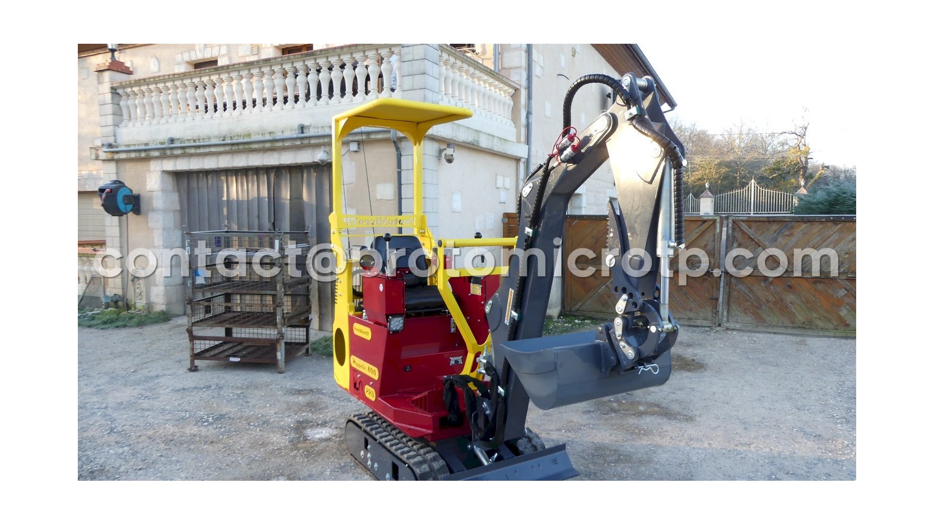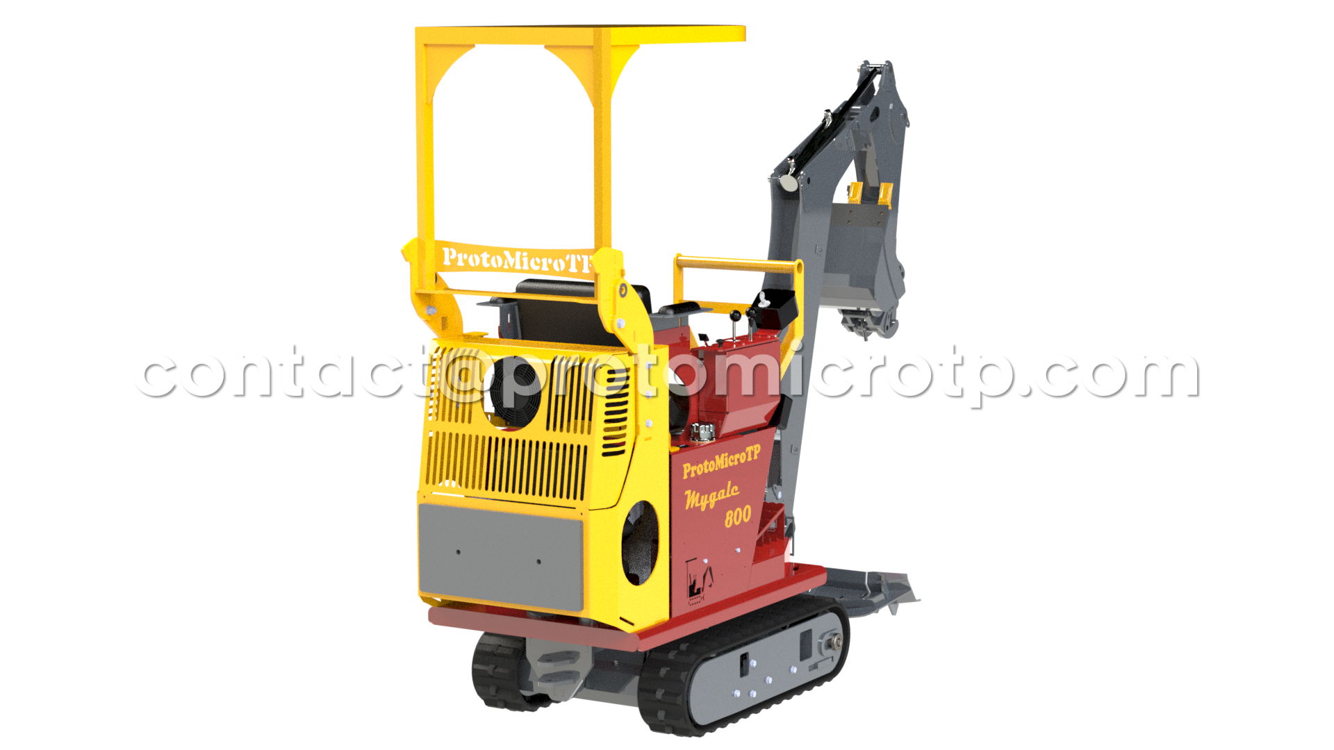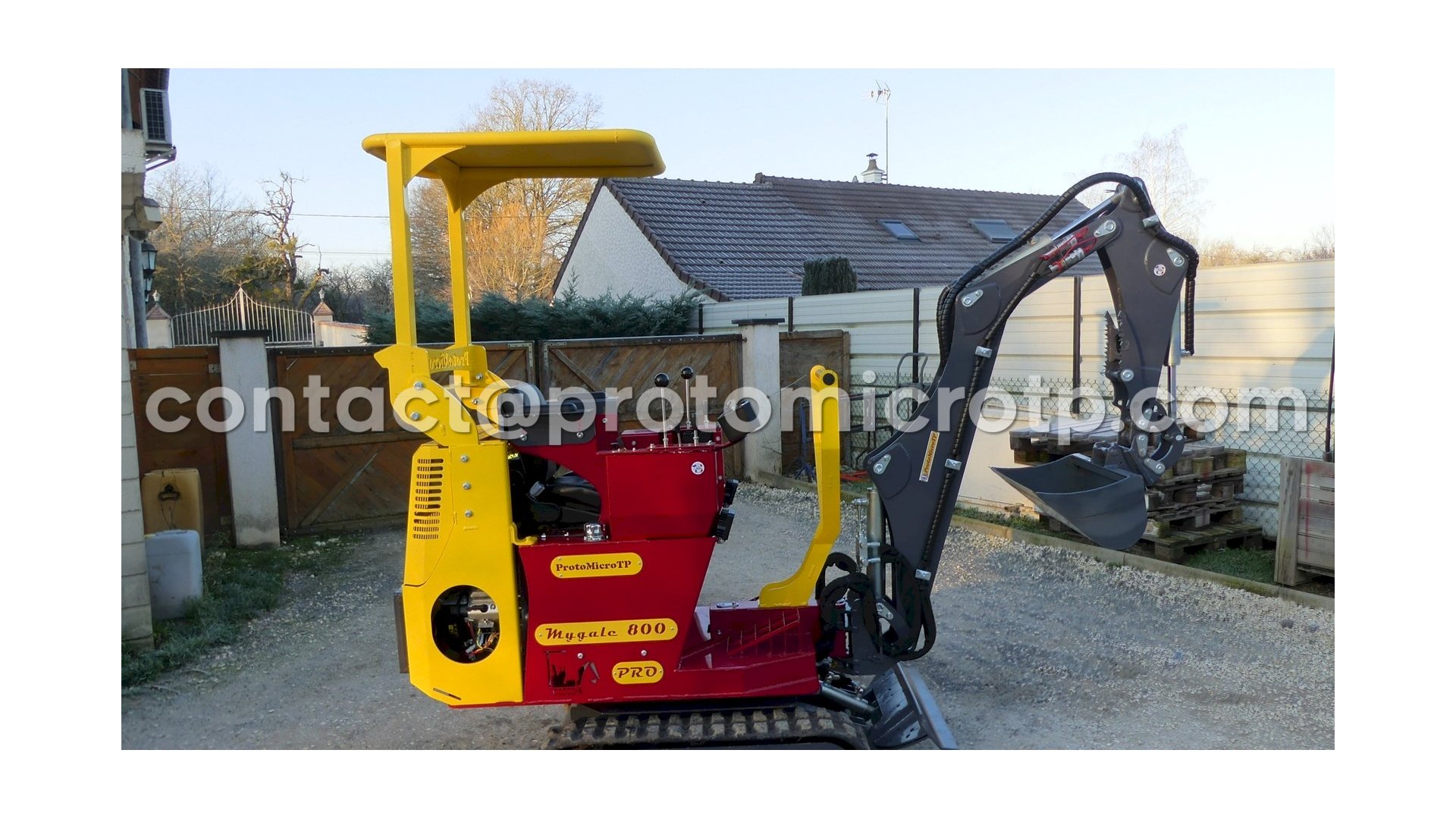 Modèle de milieu de gamme de la série Mygale, avec une largeur de 83cm, la Micro Pelle Mygale 800 Pro est dotée d'une tourelle pivotant à 360° et d'un pied de flèche à 110°,