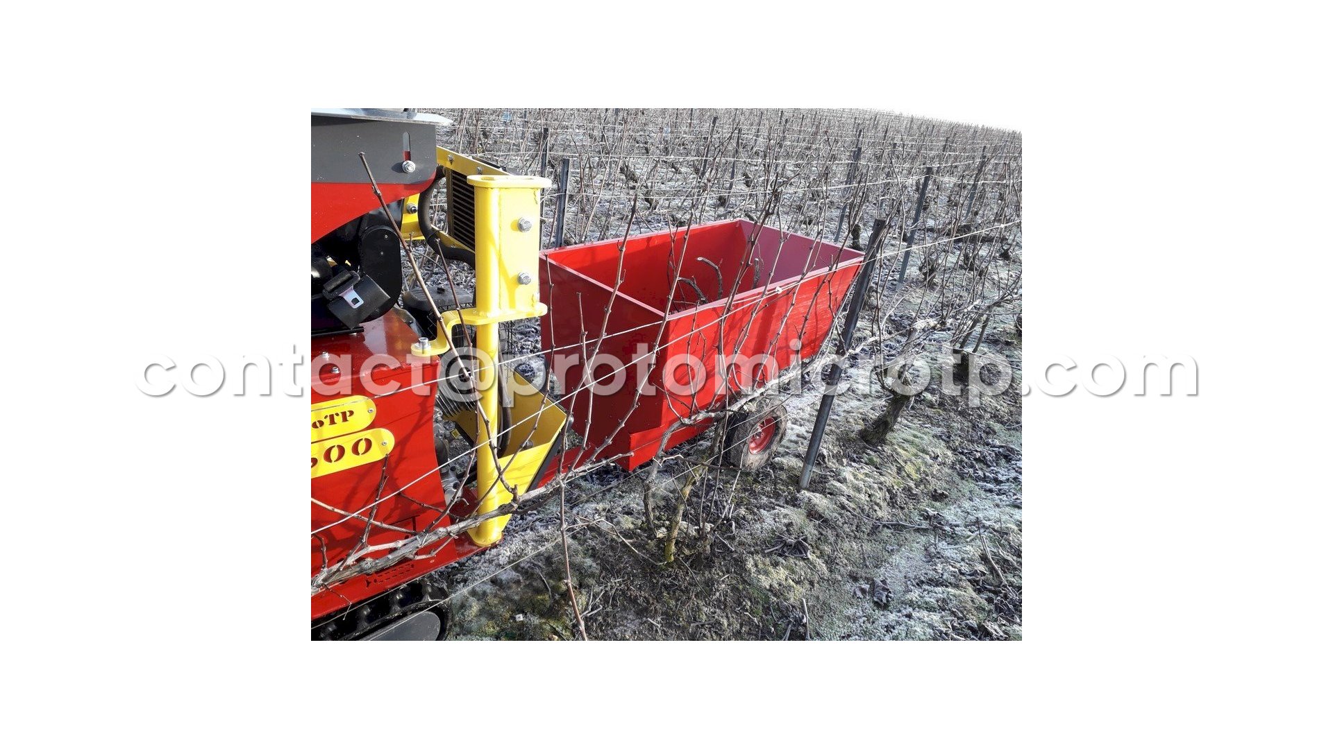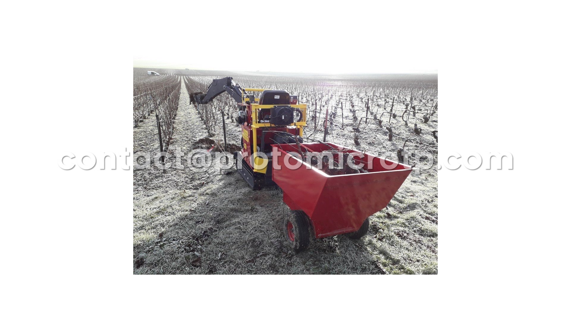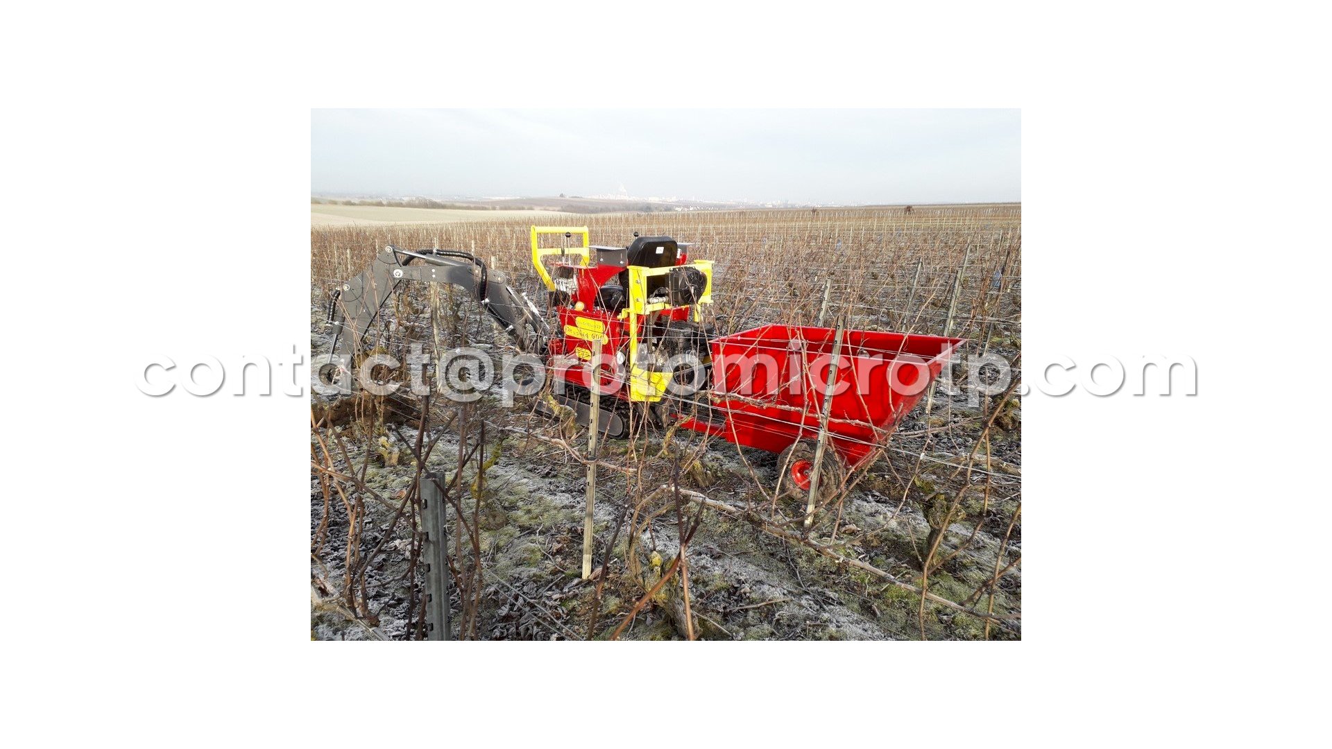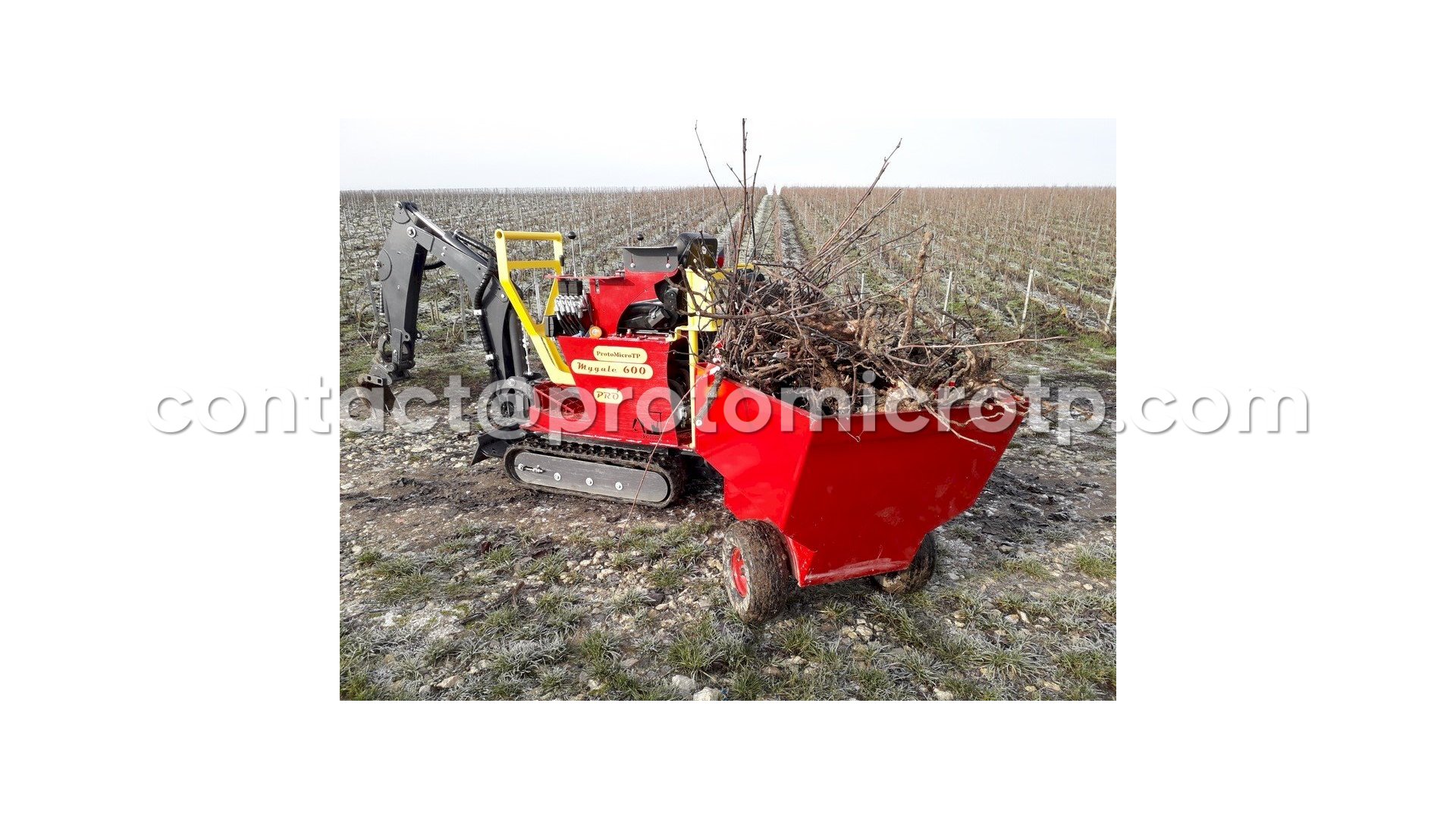 Remorque à atteler deriere une micro pelle, idéale pour le passage dans les vignes.